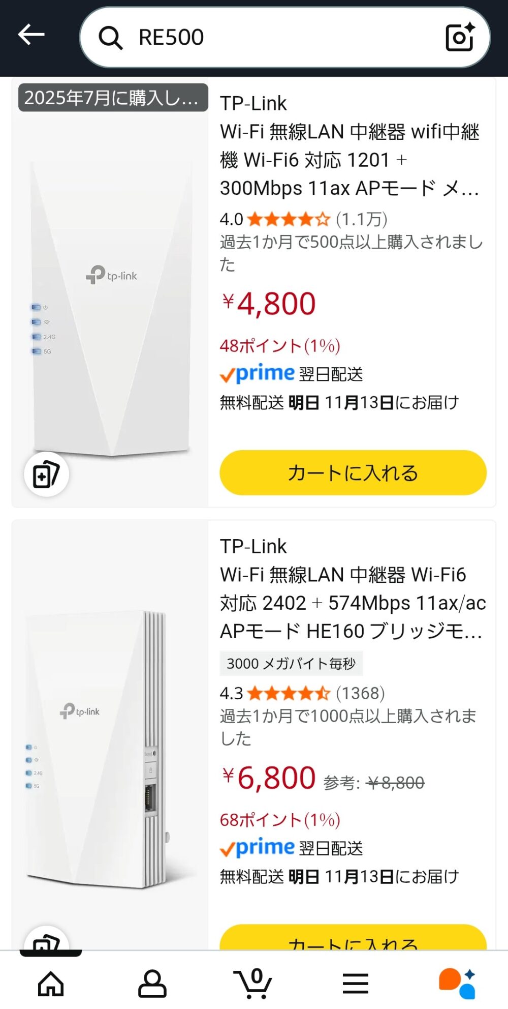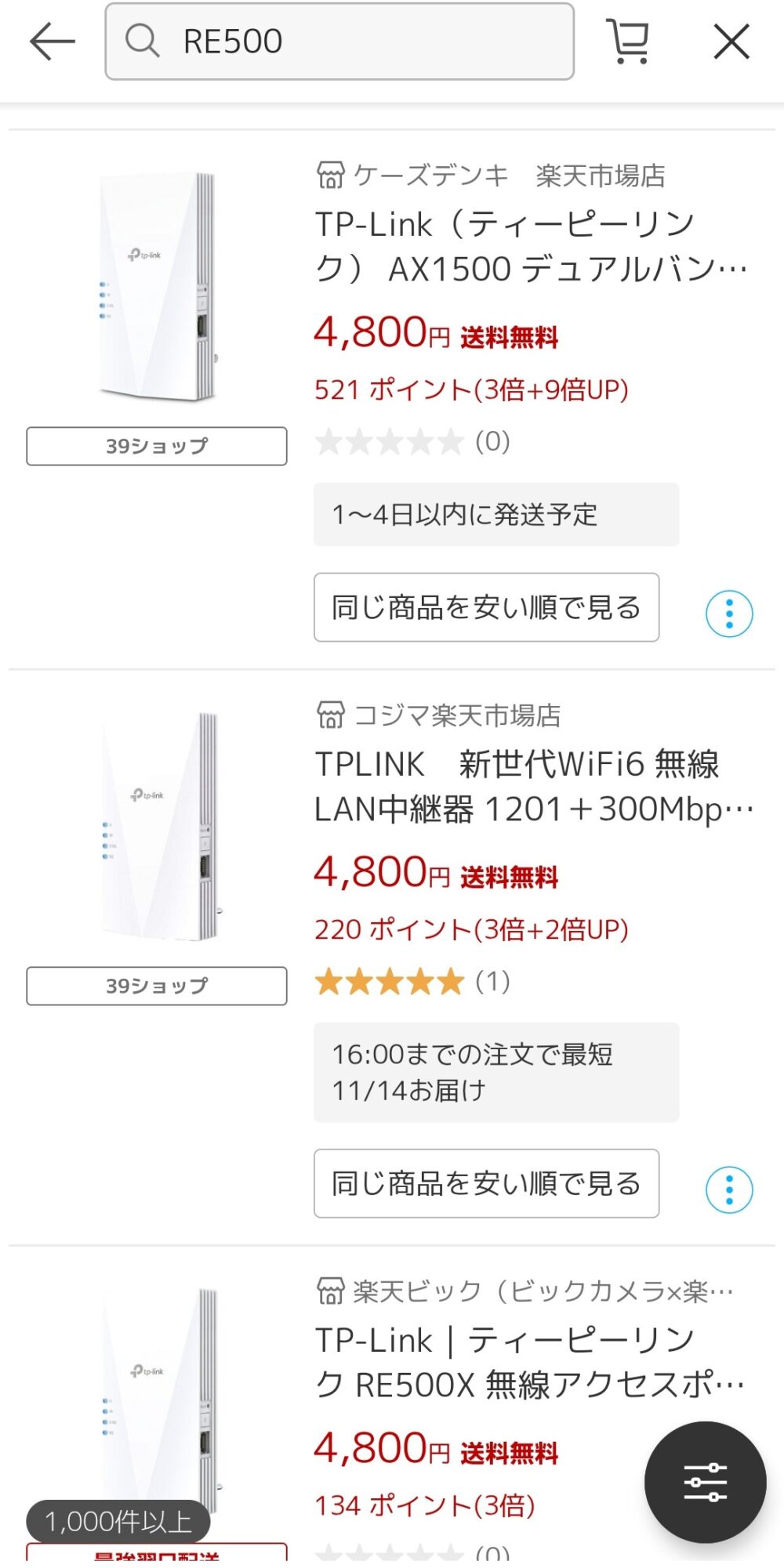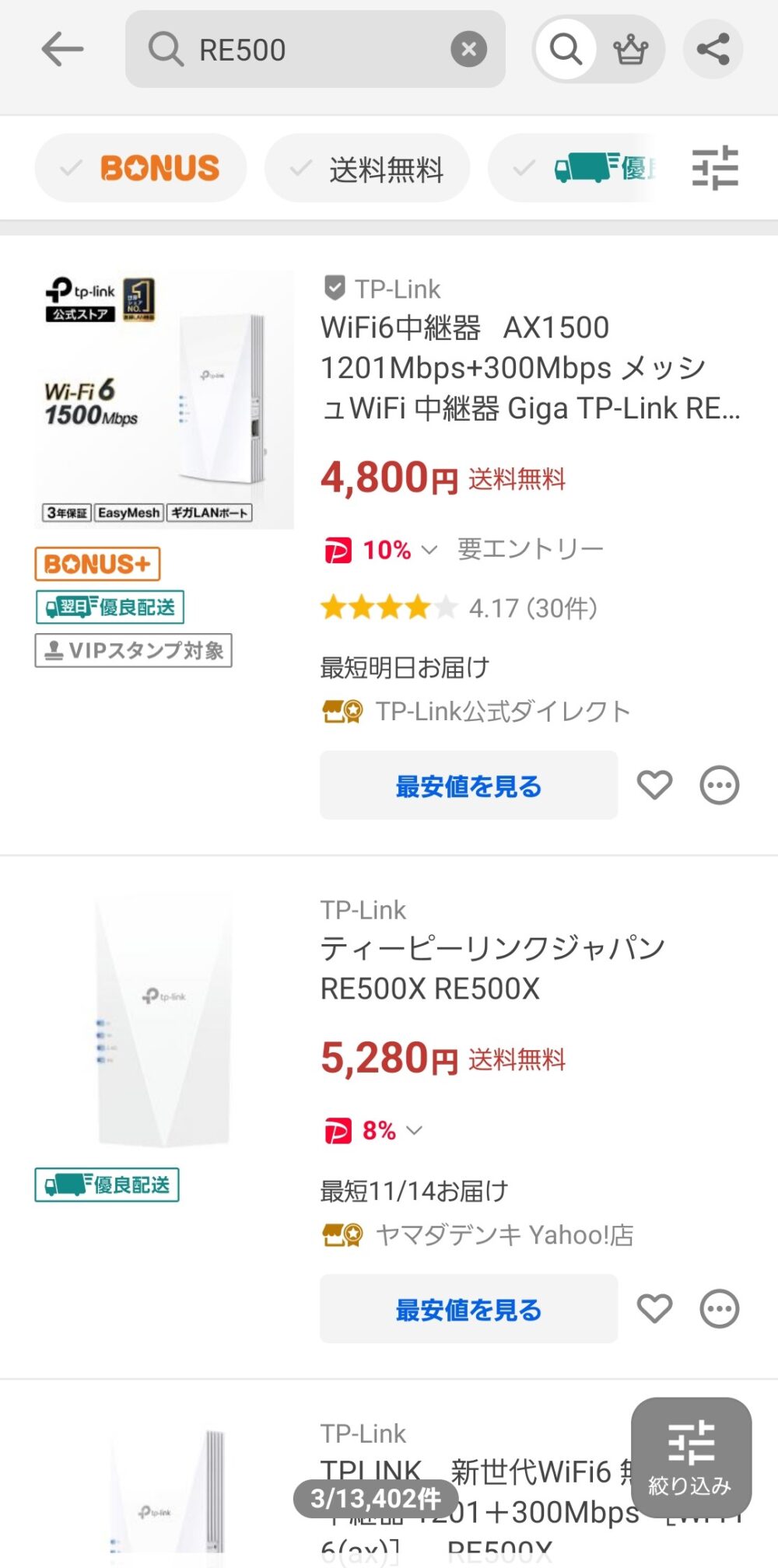 EasyMesh互換対応ながらもRE500Xは4,000円台で購入できるため比較的手軽に試せます。もし実際に設置してメッシュ化に失敗したとしても、通常どおり中継器として活躍します。